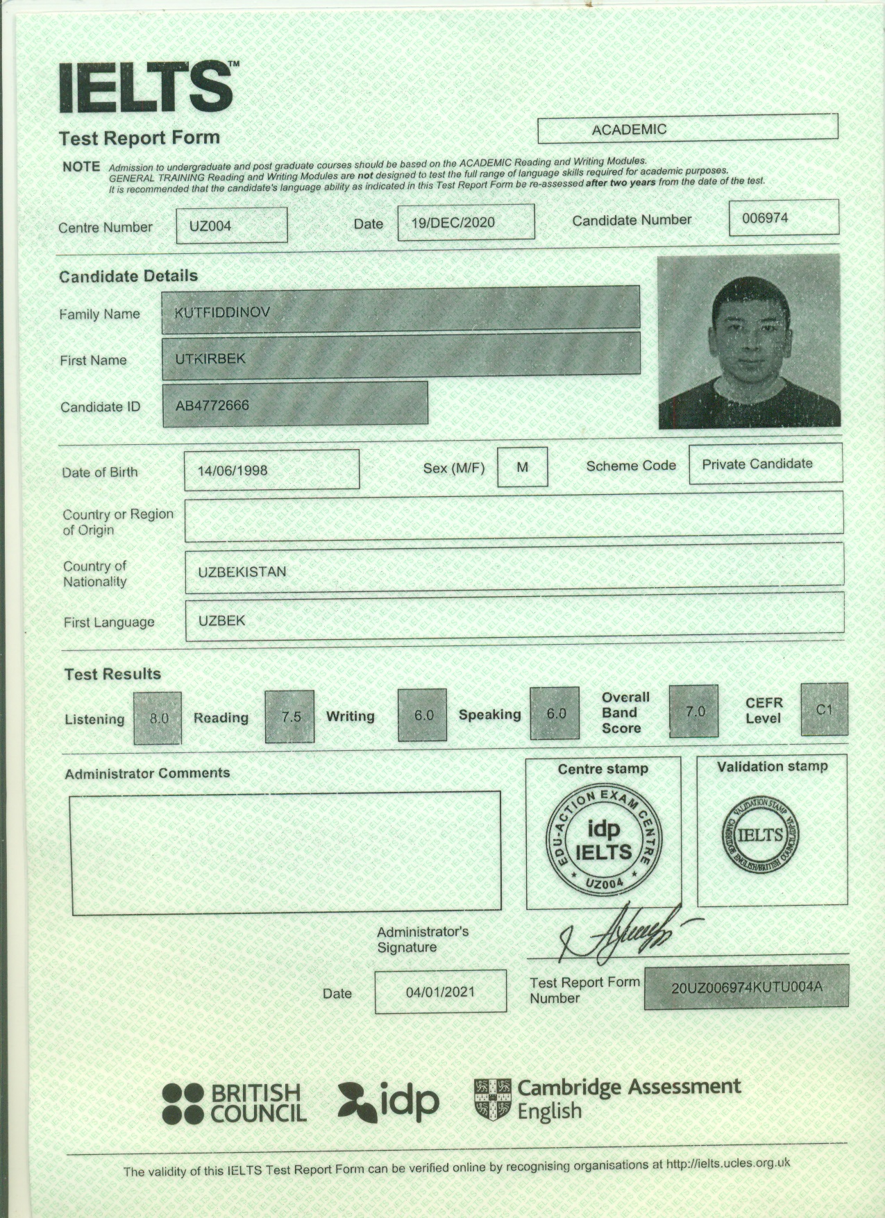 | IELTS certificate | January, 2021 | IDP IELTS | 20UZ006974KUTU004A | Click |